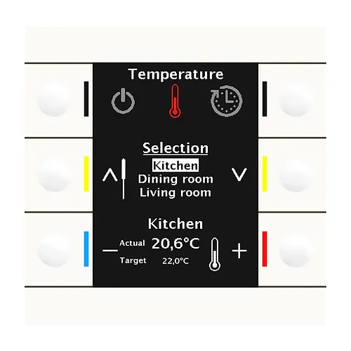 Έκδοση με 6 πλήκτρα, με έγχρωμη οθόνη και ένδειξη κατάστασης RGB. Κεντρικό σημείο ελέγχου με έως και 24 λειτουργίες λειτουργίας, χρονοδιακόπτη και ενσωματωμένο ενσωματωμένο θερμοστάτη χώρου. Ενσωματωμένη μονάδα ζεύξης διαύλου