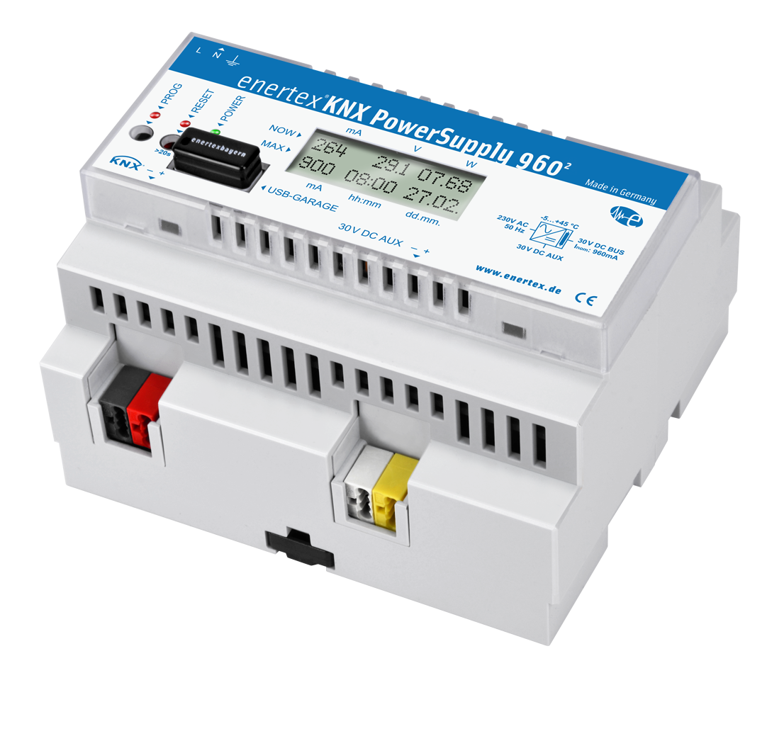 Η μονάδα τροφοδοσίας KNXPowerSupply960 (6 SU) με ενσωματωμένο τσοκ τροφοδοτεί το δίαυλο με σταθεροποιημένη τάση DC 30 V DC, παρέχοντας ρεύμα 960 mA. Μια ενσωματωμένη σύνδεση διαύλου προσφέρει πολλές διαγνωστικές λειτουργίες και χρονοδιακόπτες.