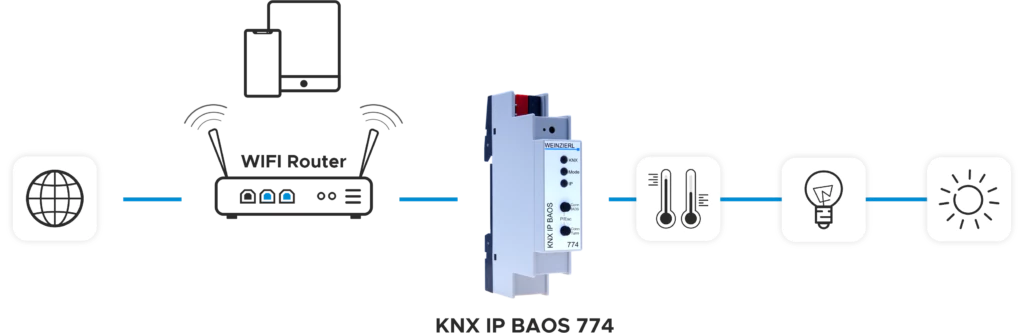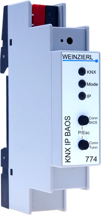 Το KNX IP BAOS 774 χρησιμοποιείται ως διεπαφή για σύνδεση στο KNX τόσο σε επίπεδο τηλεγραφήματος (KNXnet/IP Tunneling) όσο και σε επίπεδο σημείου δεδομένων (Επίπεδο εφαρμογής KNX). Οι πελάτες μπορούν να αποκτήσουν απευθείας πρόσβαση σε αντικείμενα ομάδας είτε μέσω ενός δυαδικού πρωτοκόλλου (με TCP/IP ή UDP/IP) είτε μέσω των Υπηρεσιών Ιστού JSON (Java Script Object Notation). Η συσκευή έχει διαμορφωθεί με το ETS και υποστηρίζει έως και 1.000 αντικείμενα επικοινωνίας. Υποστηρίζονται 10 ταυτόχρονες συνδέσεις πελάτη.